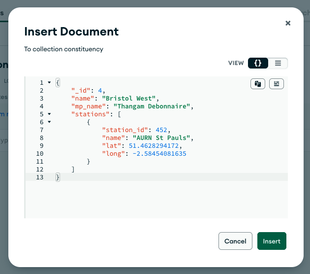 Because I was modelling just one station, I decided to use the opportunity to write a small JSON document, so I manually inputted the constituency and its embedded station into Atlas.