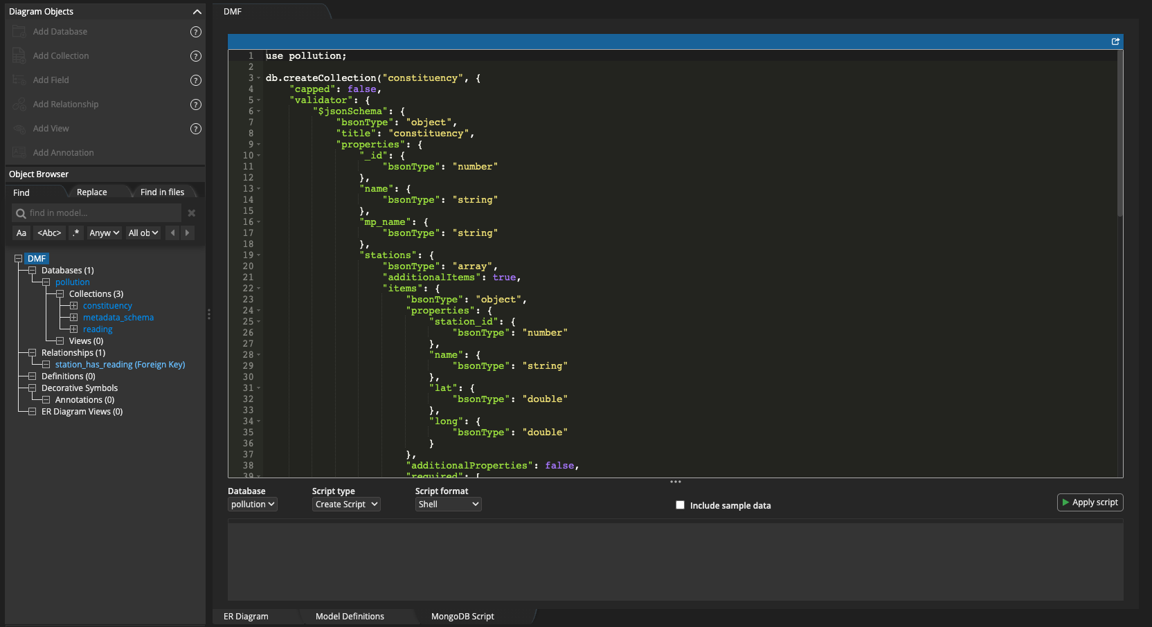 For Component 6, I used the same air quality dataset, modelling and mapping one of its stations in a NoSQL database. I designed a model, cropped and cleaned the data, and built a MongoDB database into which I imported and queried the data.