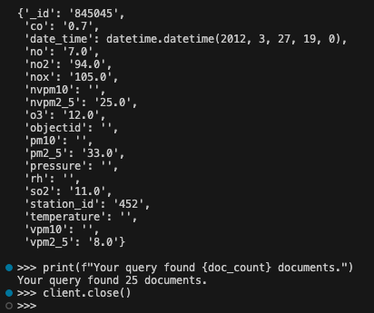 I was still able to run an equality query using PyMongo. I filtered my data to all records where SO2 is equal to “11.0”, which returned 25 documents.