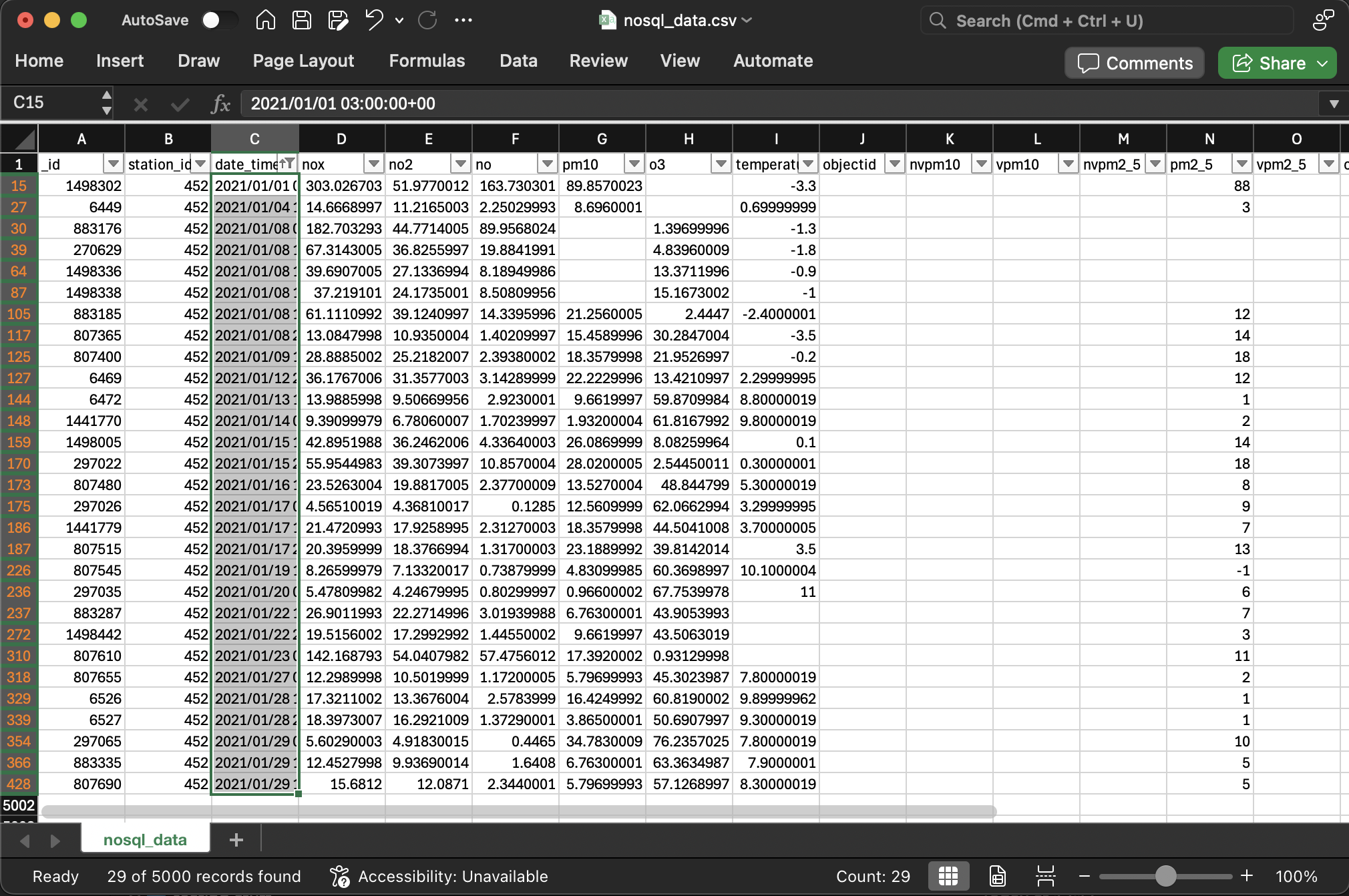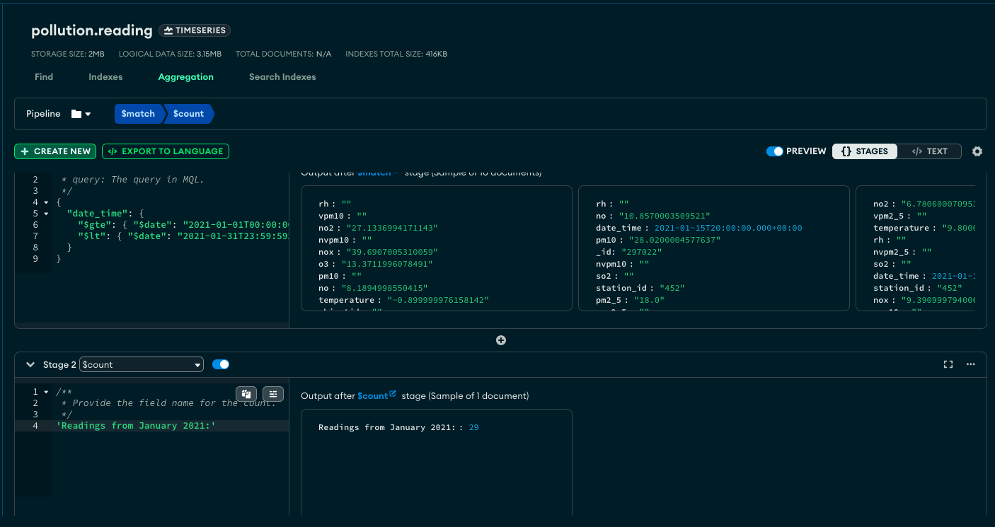 To gain experience in another tool, I learnt how to build a pipeline aggregation query in MongoDB Compass, which enabled me to query my data by datetime. I filtered the data to all records from January 2021; Compass returned 29 documents and I checked this in Excel to confirm the accuracy of my pipeline.