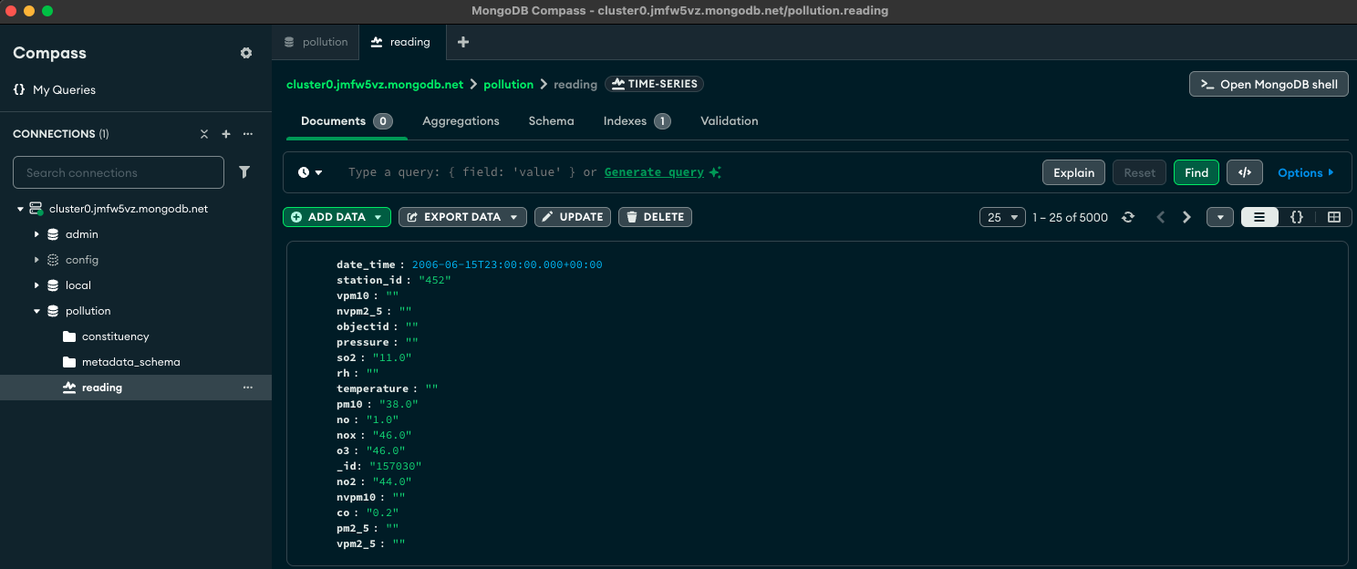Having used both relational and NoSQL databases to store and query the air pollution dataset, I feel that NoSQL is more suited to this use case – particularly thanks to MongoDB’s timeseries functionality. A MongoDB timeseries collection can handle large volumes of data, which may scale very quickly, and offers ‘performance benefits including improved query efficiency and reduced disk usage’ (Alessia 2023).