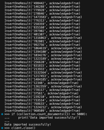 The import process resulted in some key learning. I followed a MongoDB tutorial (Ranjan, n.d.) to connect to my database and use PyMongo to import CSV data. However, upon running my script I realised that the tutorial was designed to show users how to import one document, not the 5,000 created from my CSV file. My import took over three minutes because every individual line was run using insert_one(); in future I will use an alternative approach such as batch-importing using insert_many(). Alternatively, I could explore other tools to find a more efficient method than reading from a CSV, then writing, then importing.