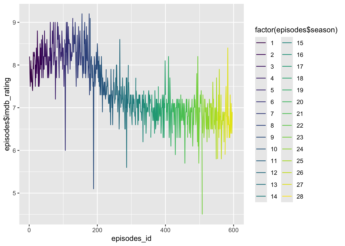 # plot ratings over time by season ggplot(episodes, aes(x = episodes_id, y = episodes$imdb_rating, color =factor(episodes$season))) +geom_line() +scale_color_viridis_d()