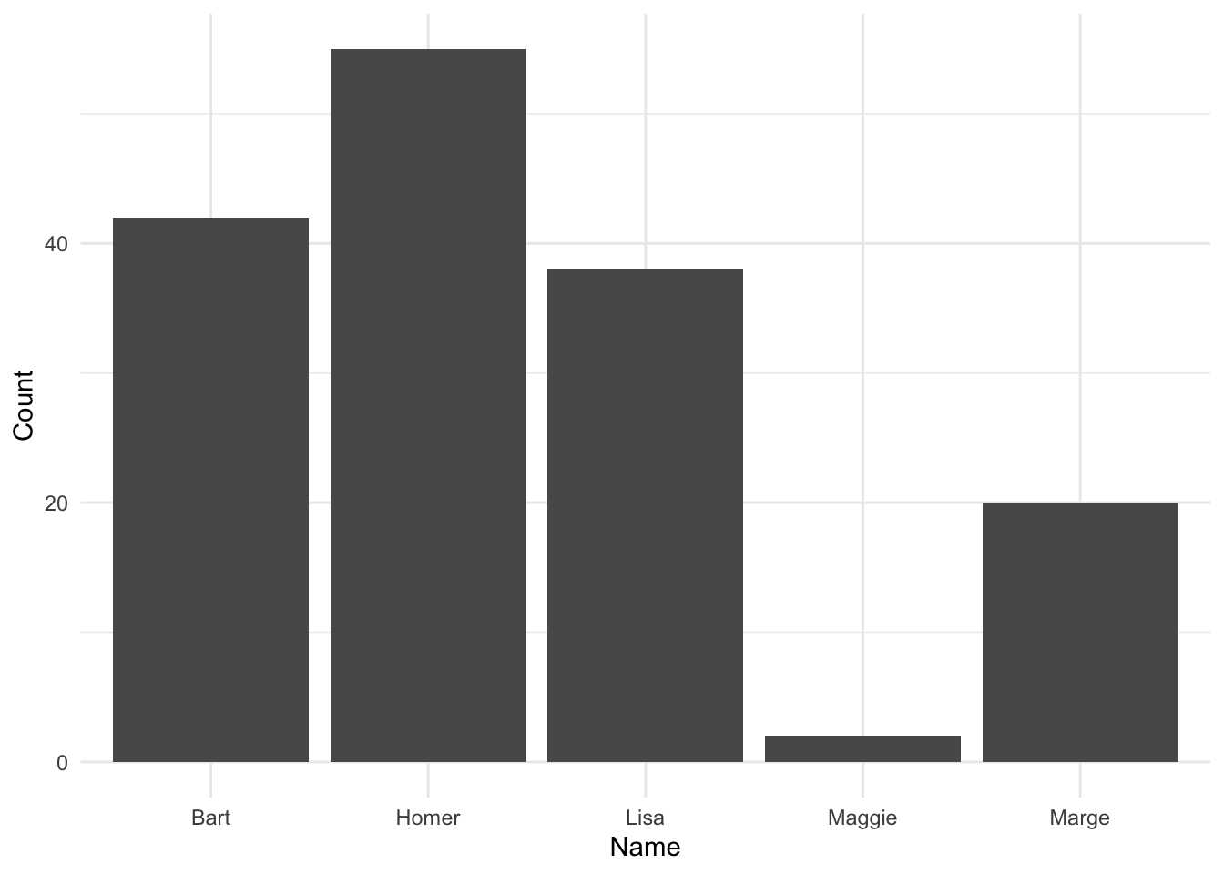 # visualise frequency of character names appearing in episode titlesggplot(name_freq, aes(x = Name, y = Count)) +geom_bar(stat ="identity") +theme_minimal()